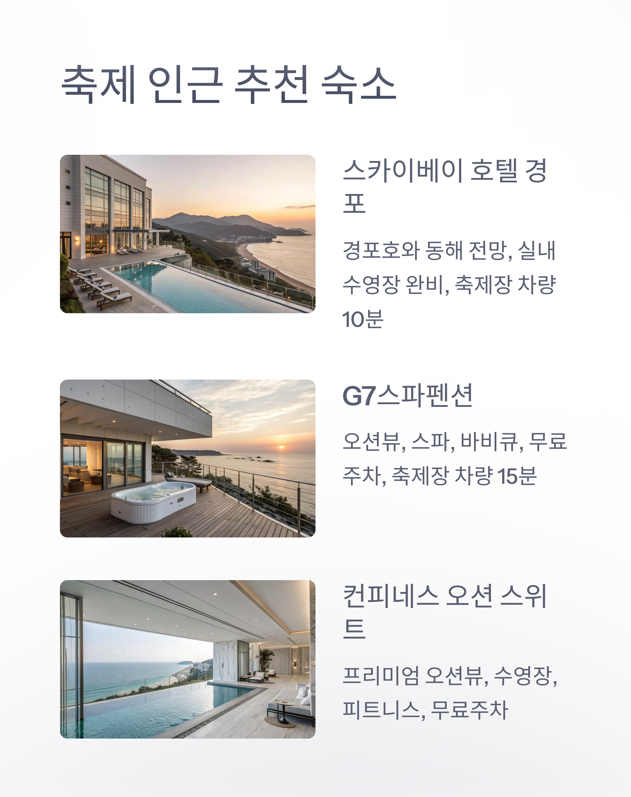 축제장과 가까운 호텔, 오션뷰 펜션, 가족 단위 숙소를 엄선해 안내합니다. 숙소별 예약 바로가기 버튼도 함께 제공합니다.