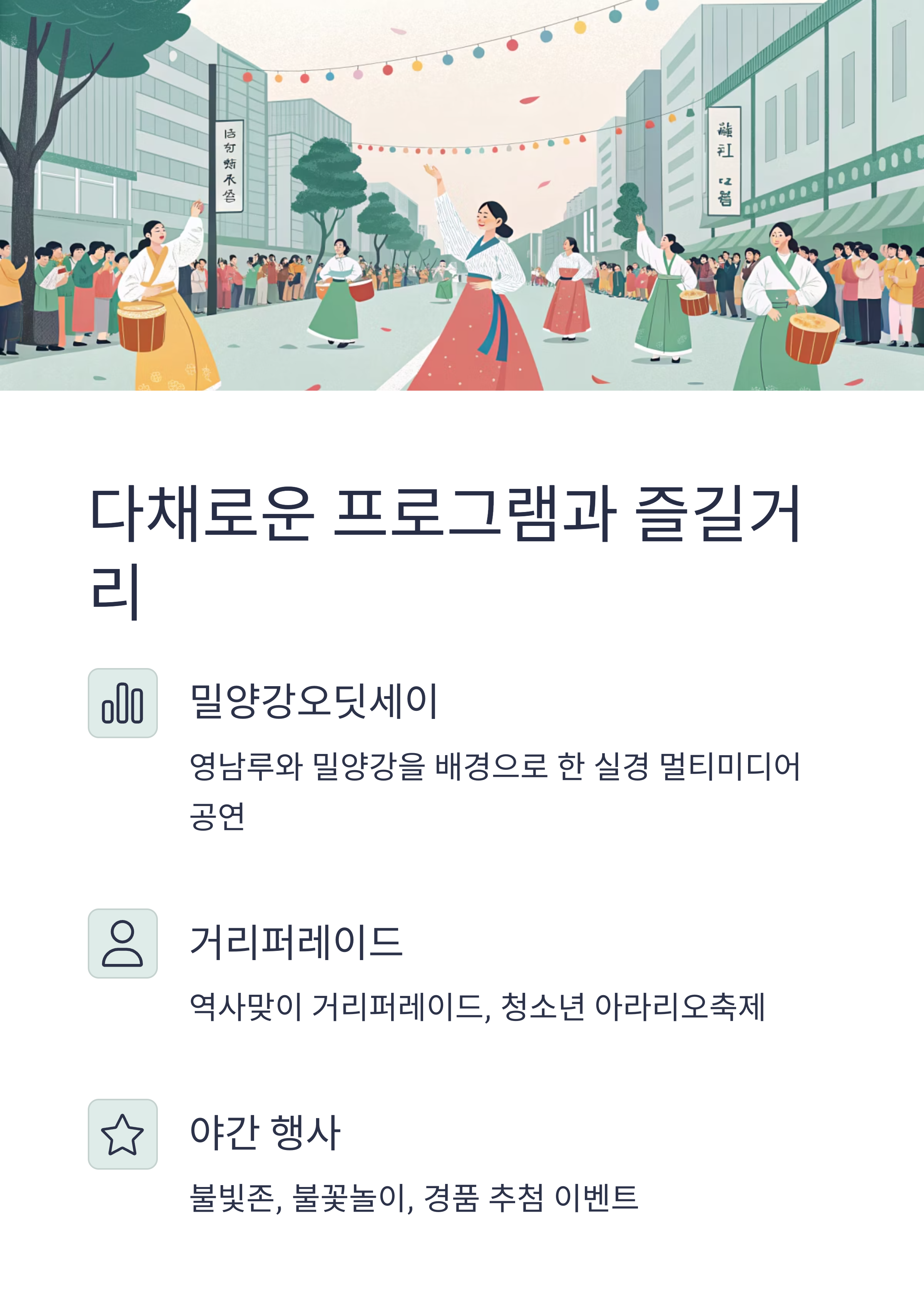 전 연령층이 함께 즐길 수 있는 다양한 전통·현대 공연과 체험, 지역 특산물 시식, 아름다운 밀양강 야경까지 모두 경험할 수 있습니다.
