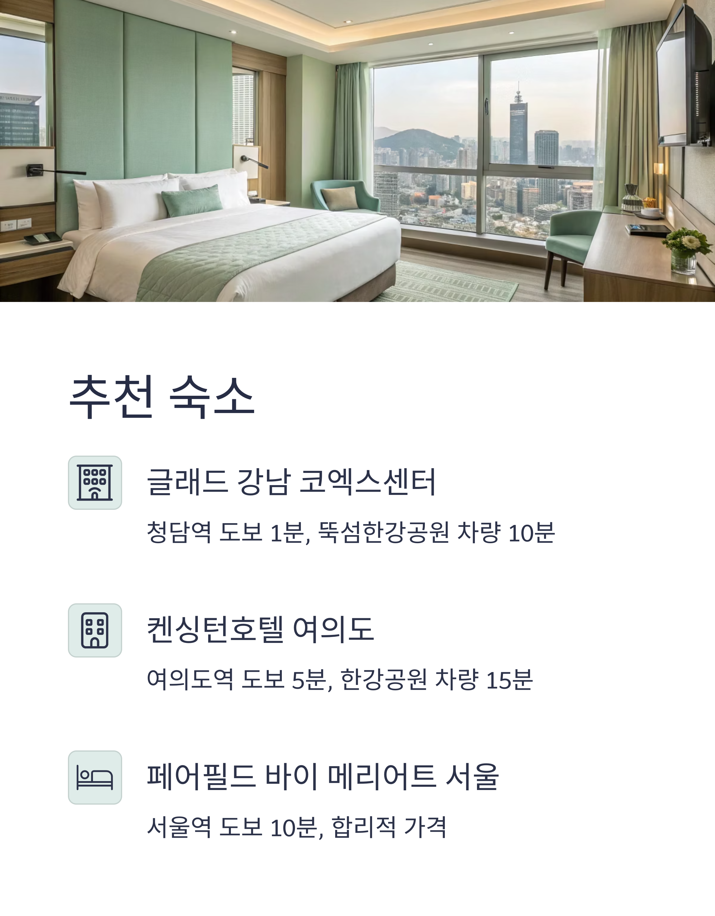 뚝섬한강공원과 가까운 서울 동부(건대입구, 광진구, 성동구), 서울역·명동·강남 등 주요 지역의 인기 호텔, 게스트하우스, 감성 숙소를 추천합니다. 각 숙소별 예약 바로가기 버튼도 함께 제공합니다.