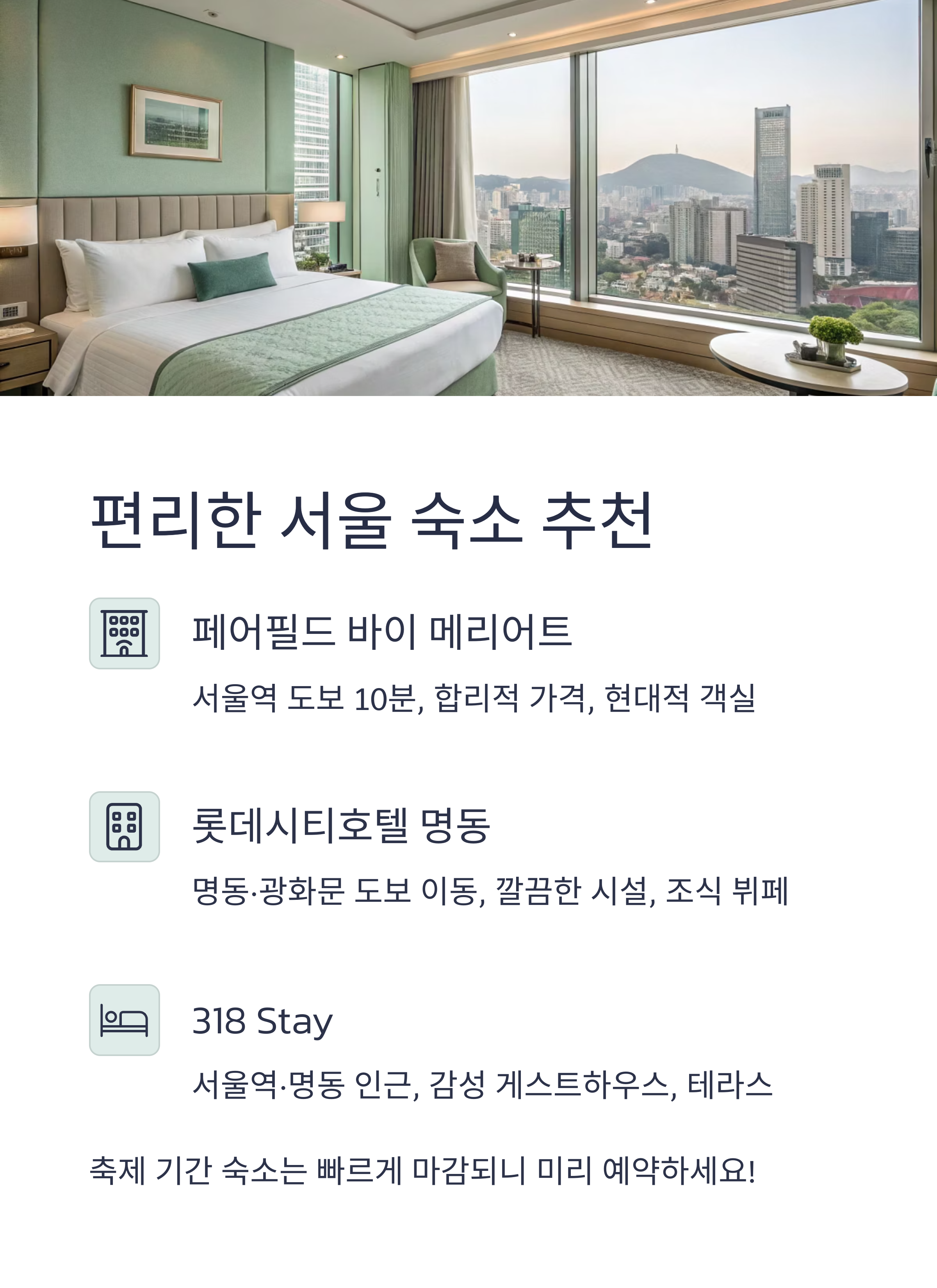 서울역, 명동, 강남 등 백화점 페스티벌 행사장과 접근성이 좋은 인기 호텔과 게스트하우스를 추천합니다. 각 숙소별 예약 바로가기 버튼도 함께 제공합니다.