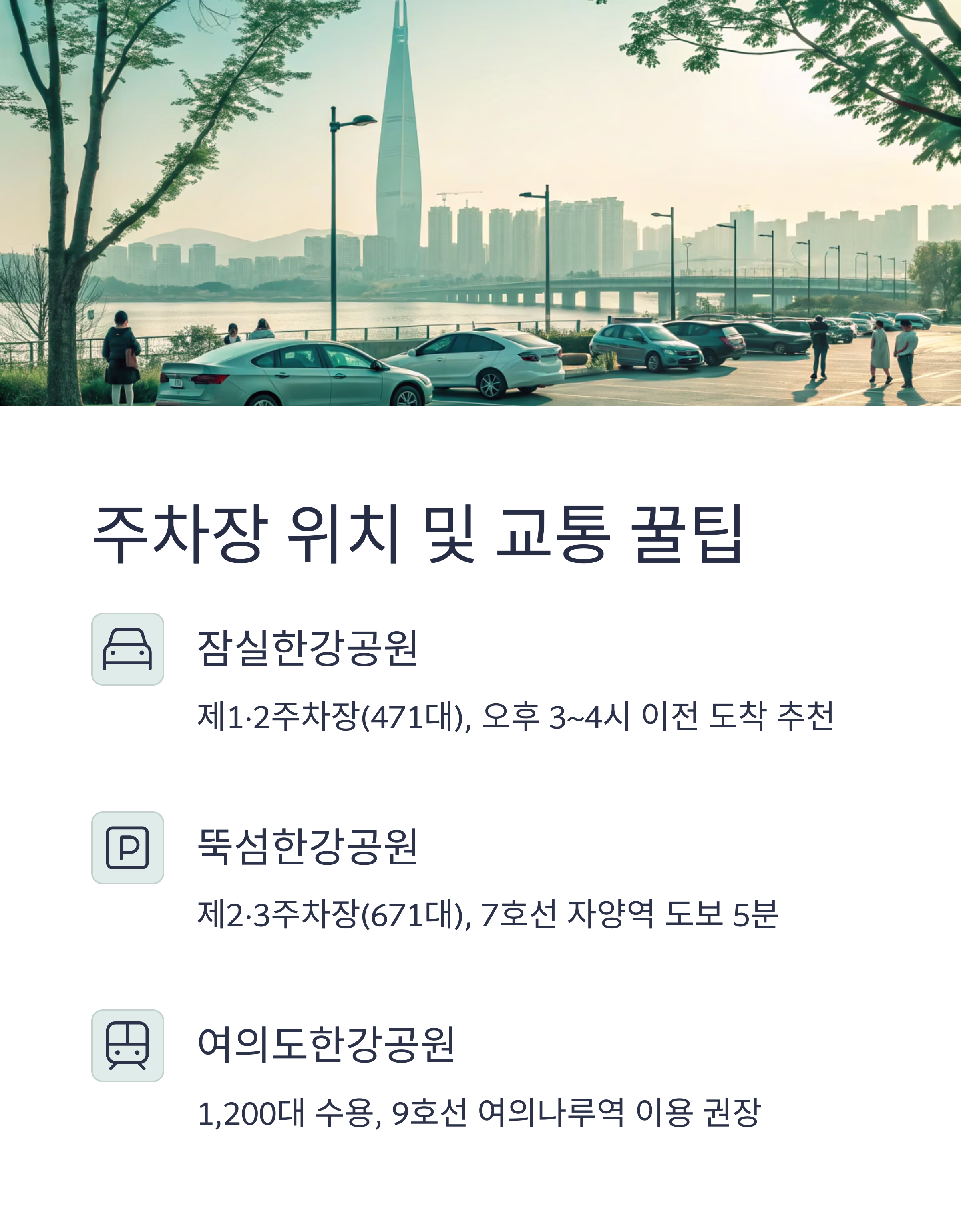 - 주차장: 여의도한강공원 주차장(1·2·3주차장, 총 1,200대 이상 수용)