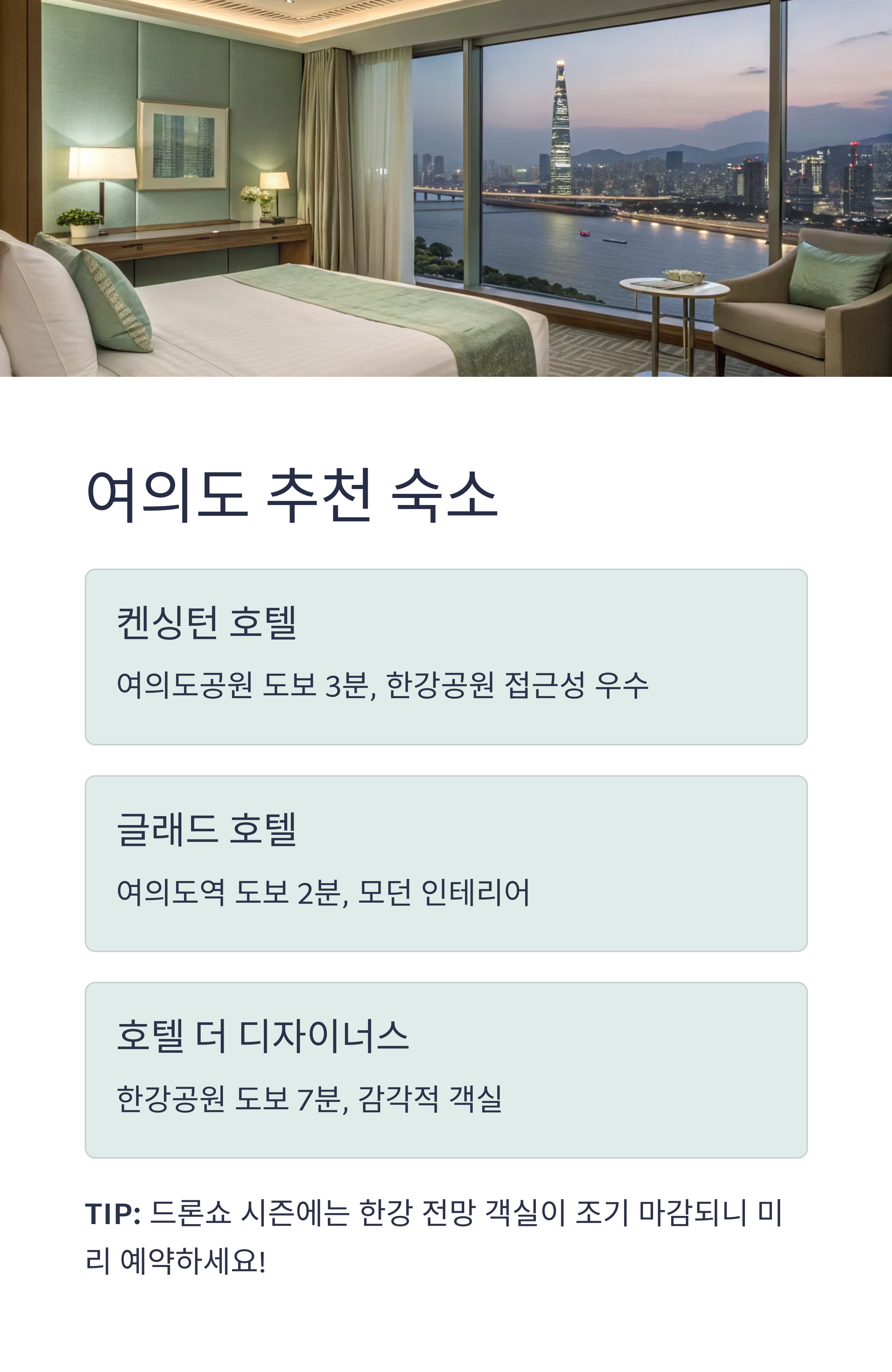 한강 드론쇼와 야경을 객실에서 감상하거나, 도보로 한강공원을 오갈 수 있는 여의도 인기 호텔을 추천합니다. 각 숙소별 예약 페이지도 함께 제공합니다.