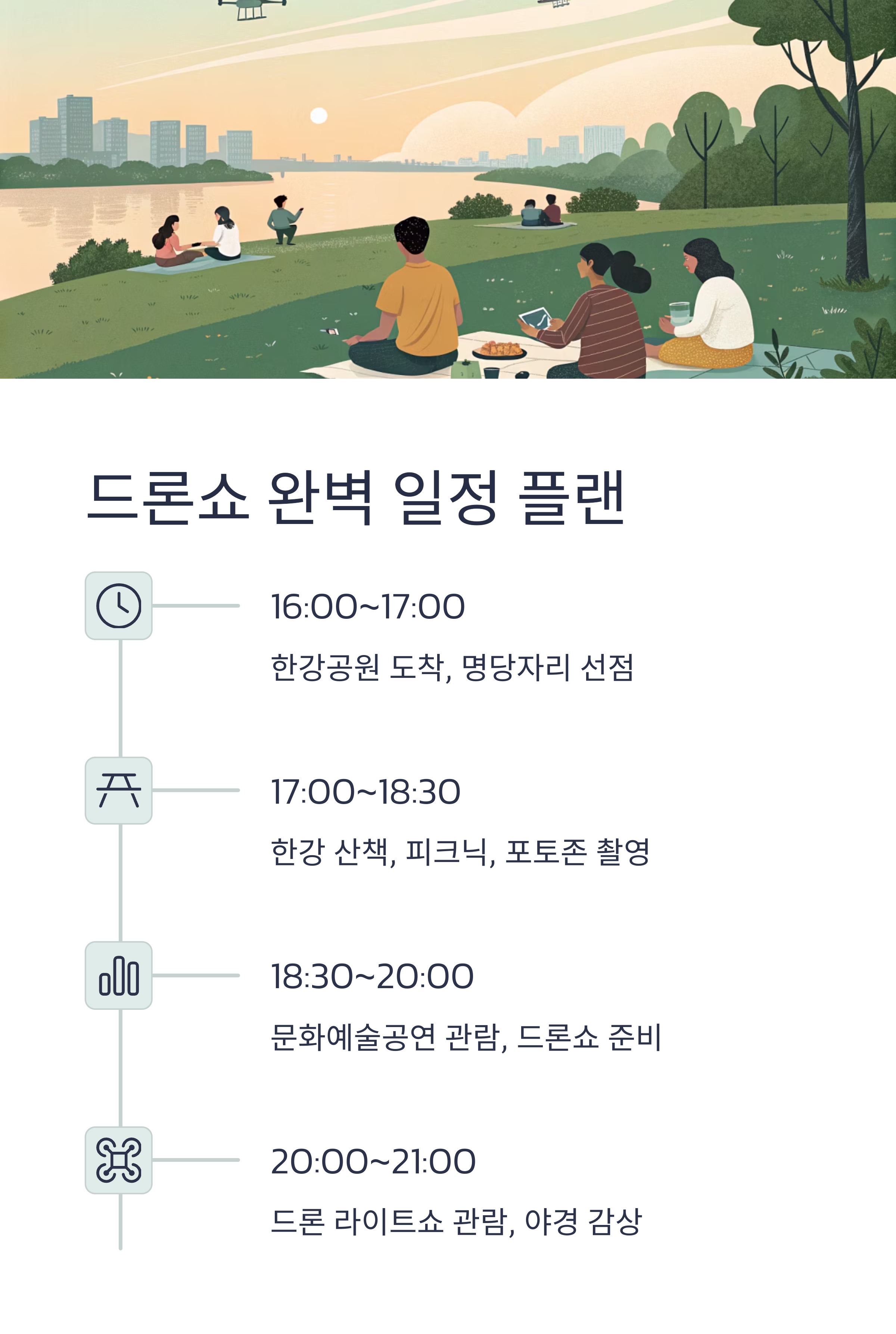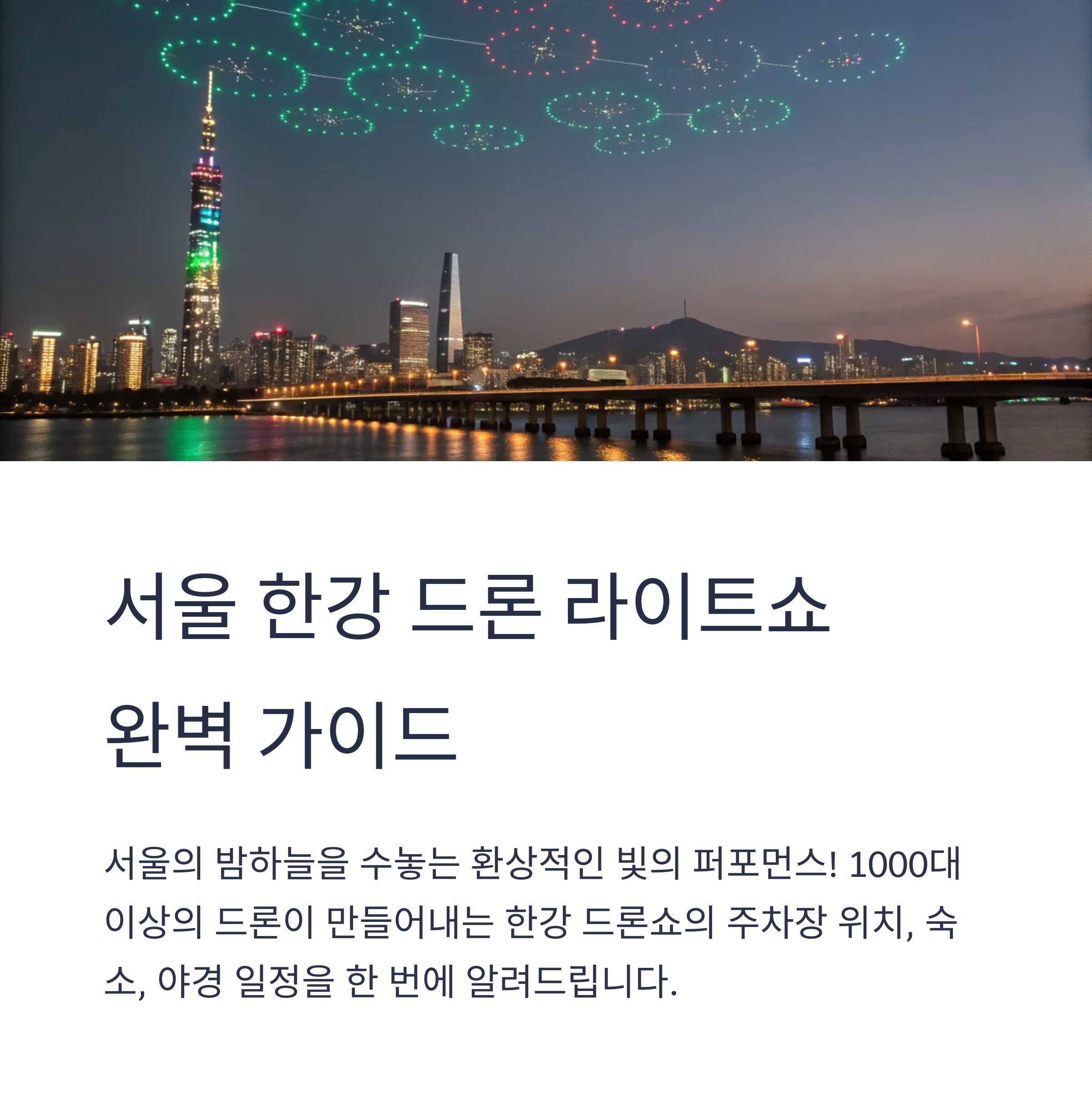 공통 꿀팁: 드론쇼 당일은 한강공원 인근 도로 및 주차장이 매우 혼잡합니다. 돗자리, 간단한 간식, 겉옷을 챙기고 일찍 도착해 피크닉을 즐기며 명당을 선점하세요. 공연 직후 바로 퇴장보다는 여유 있게 귀가 일정을 잡으면 혼잡을 피할 수 있습니다[1][6].