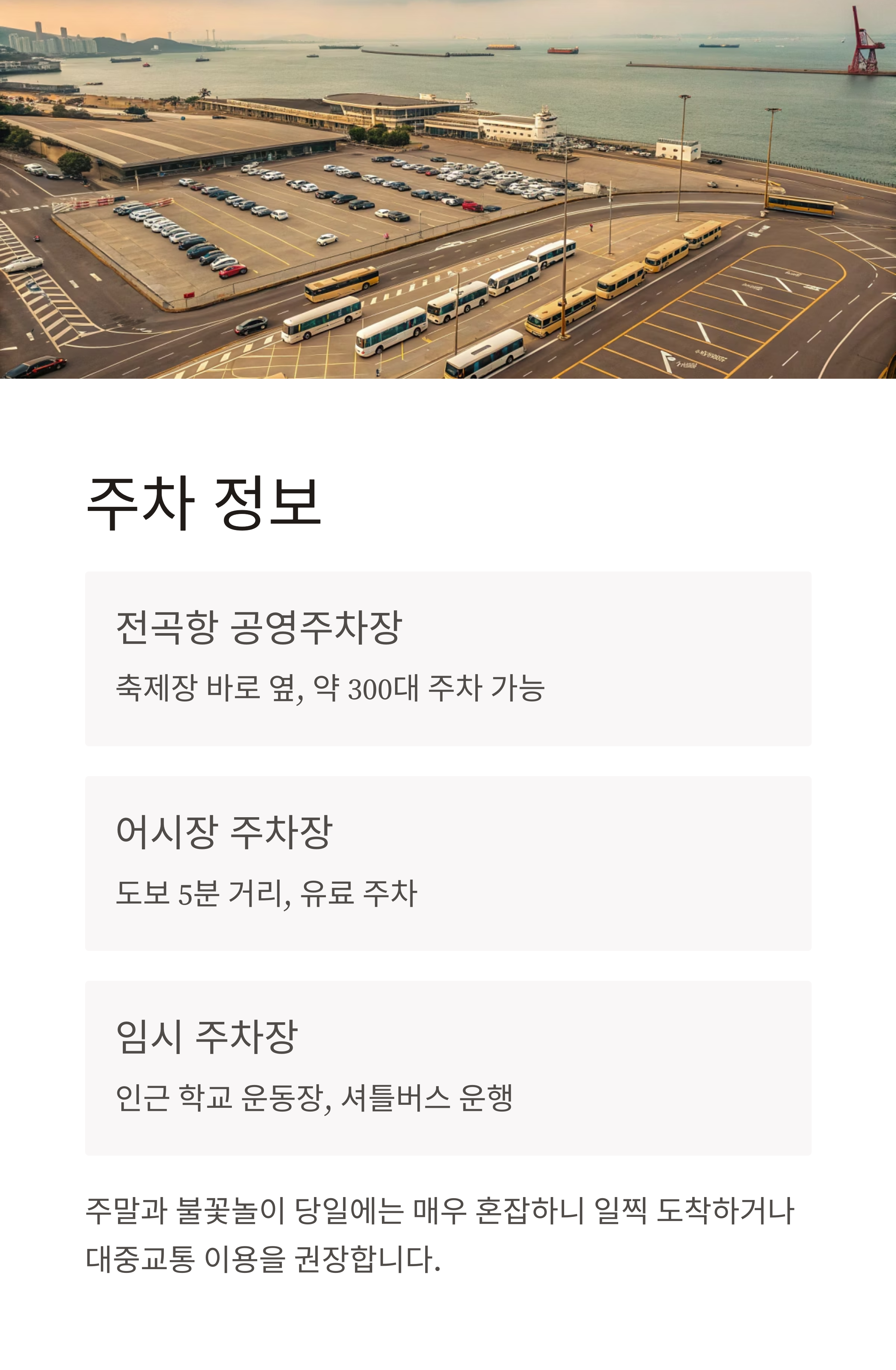 TIP: 불꽃놀이 당일에는 주차장이 매우 혼잡하므로, 대중교통 이용 또는 일찍 도착해 주차 공간을 확보하는 것이 좋습니다.