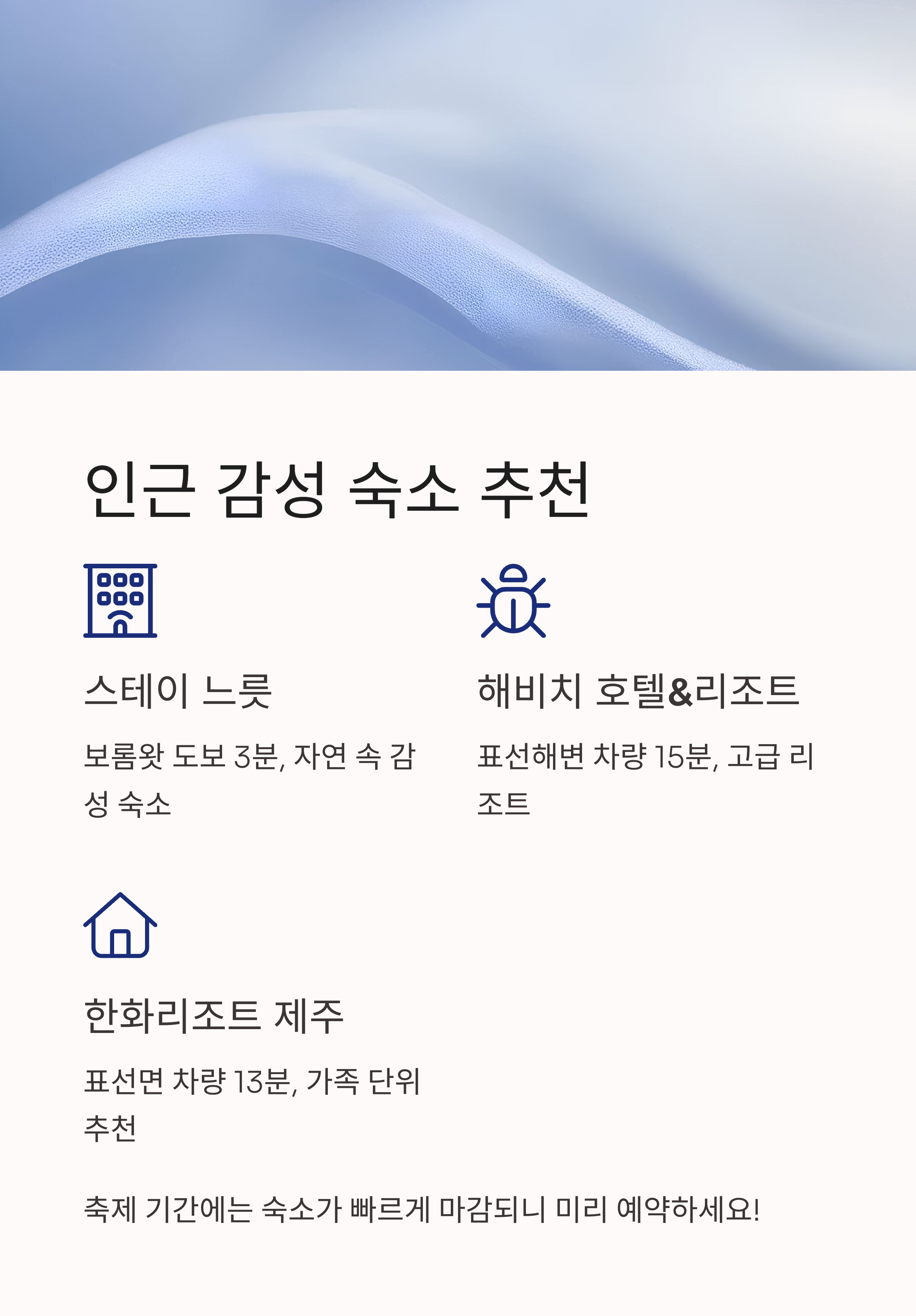 축제장 인근 표선·성산·남원·서귀포 시내 등에는 감성 호텔, 리조트, 펜션, 가족 숙소가 다양합니다. 각 숙소별 예약 버튼도 함께 제공합니다.