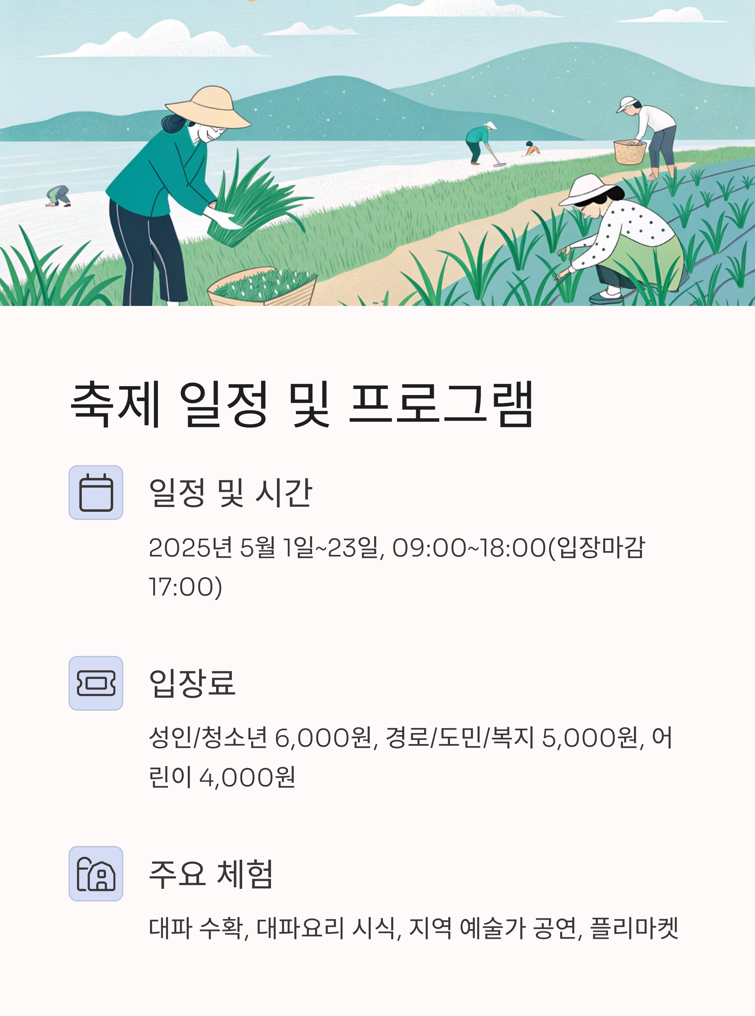 현장 팁: 오전 일찍 방문하면 주차·체험·포토존 혼잡을 피할 수 있습니다. 대파 수확 체험과 대파구이 시식은 축제의 하이라이트이며, 제주 바람을 맞으며 걷는 산책로와 포토존, 로컬 플리마켓·카페도 꼭 들러보세요. 어린이 동반 시 깡통열차(유료), 미니 동물농장, 자연체험 부스 등 가족 체험도 풍성합니다.