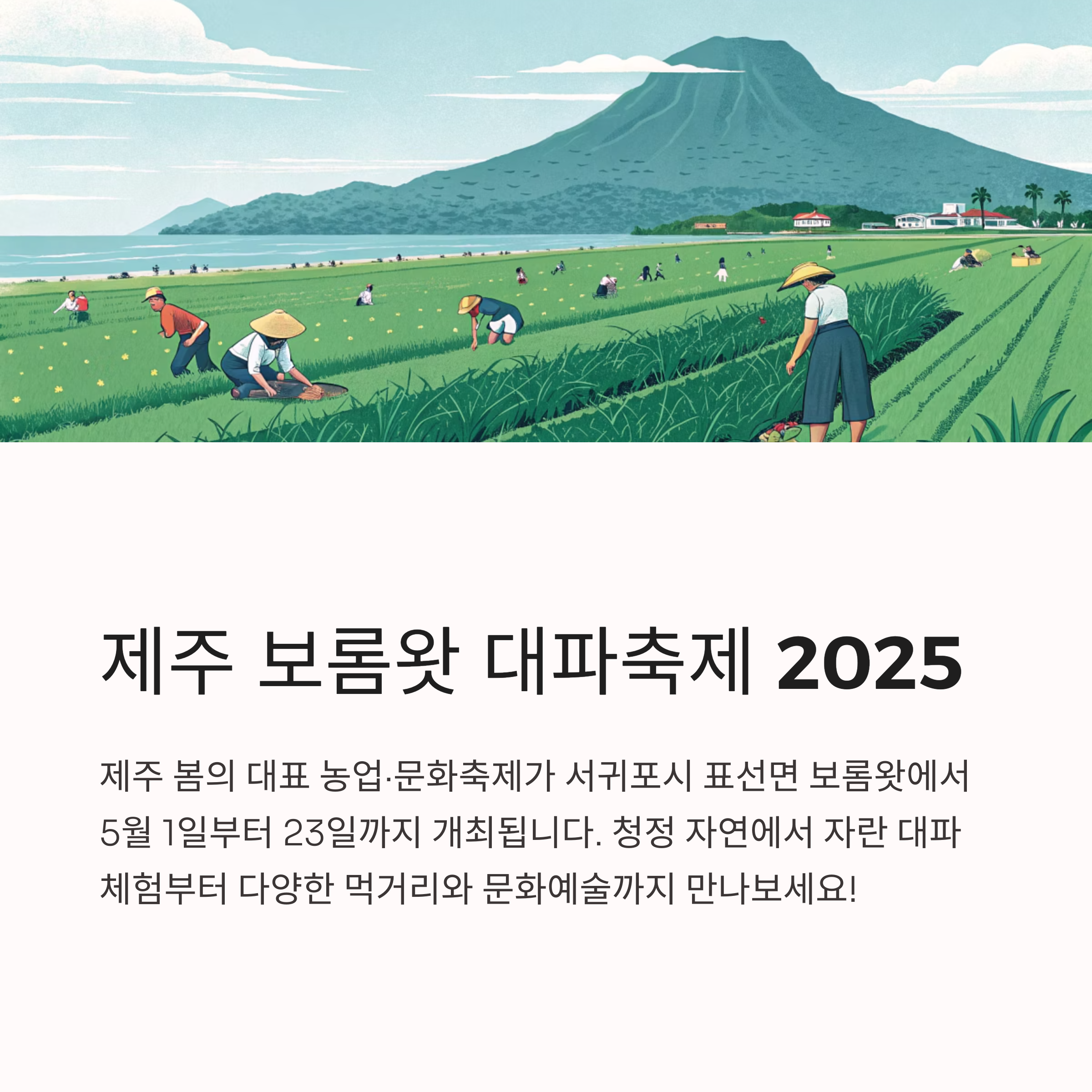 제주 봄의 대표 농업·문화축제인 보롬왓 대파축제가 2025년 5월 1일(목)부터 5월 23일(금)까지 약 3주간 서귀포시 표선면 보롬왓 일대에서 성대하게 개최됩니다. 제주 청정 자연에서 자란 대파의 맛과 가치를 직접 체험하고, 다양한 먹거리·체험·로컬 문화와 예술을 한자리에서 만날 수 있는 축제입니다. 주차장, 제주 감성 숙소, 현장 체험 일정까지 꼼꼼하게 안내합니다.