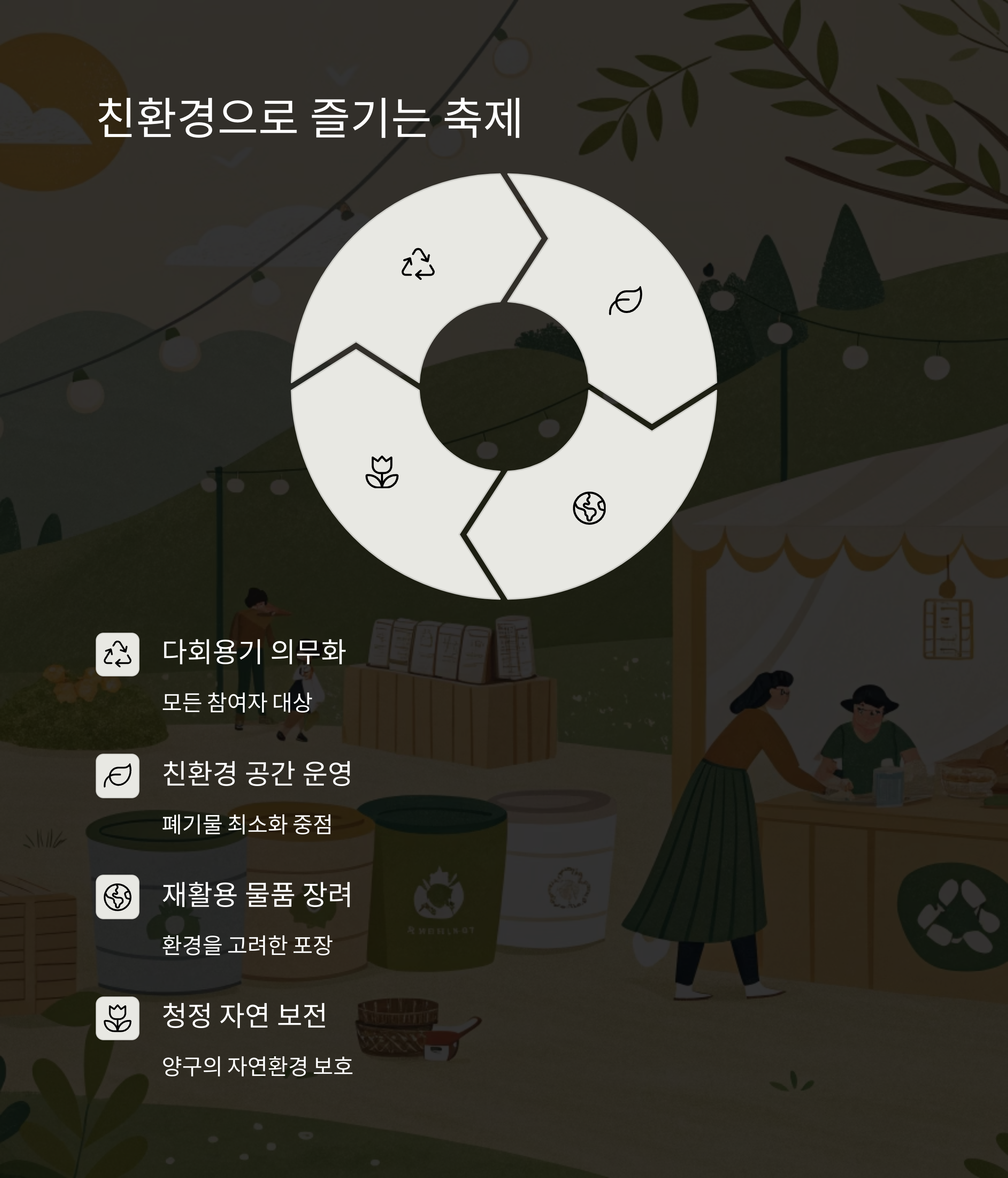 지속 가능한 친환경 행사를 목표로 다회용기를 포함한 정책을 시행합니다.