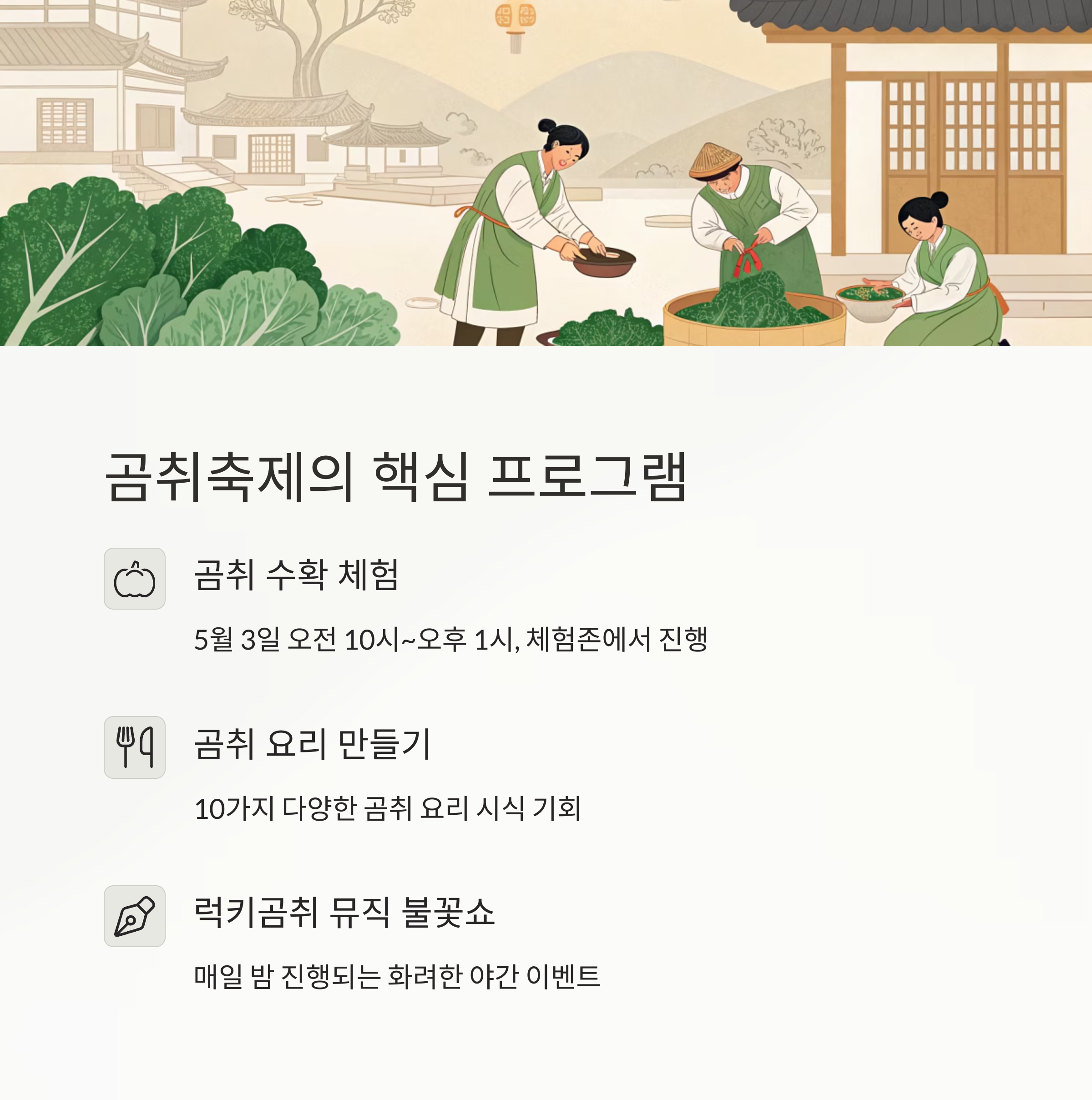 | 5월 3일 | 곰취 수확 체험 | 오전 10시 ~ 오후 1시 | 체험존 |