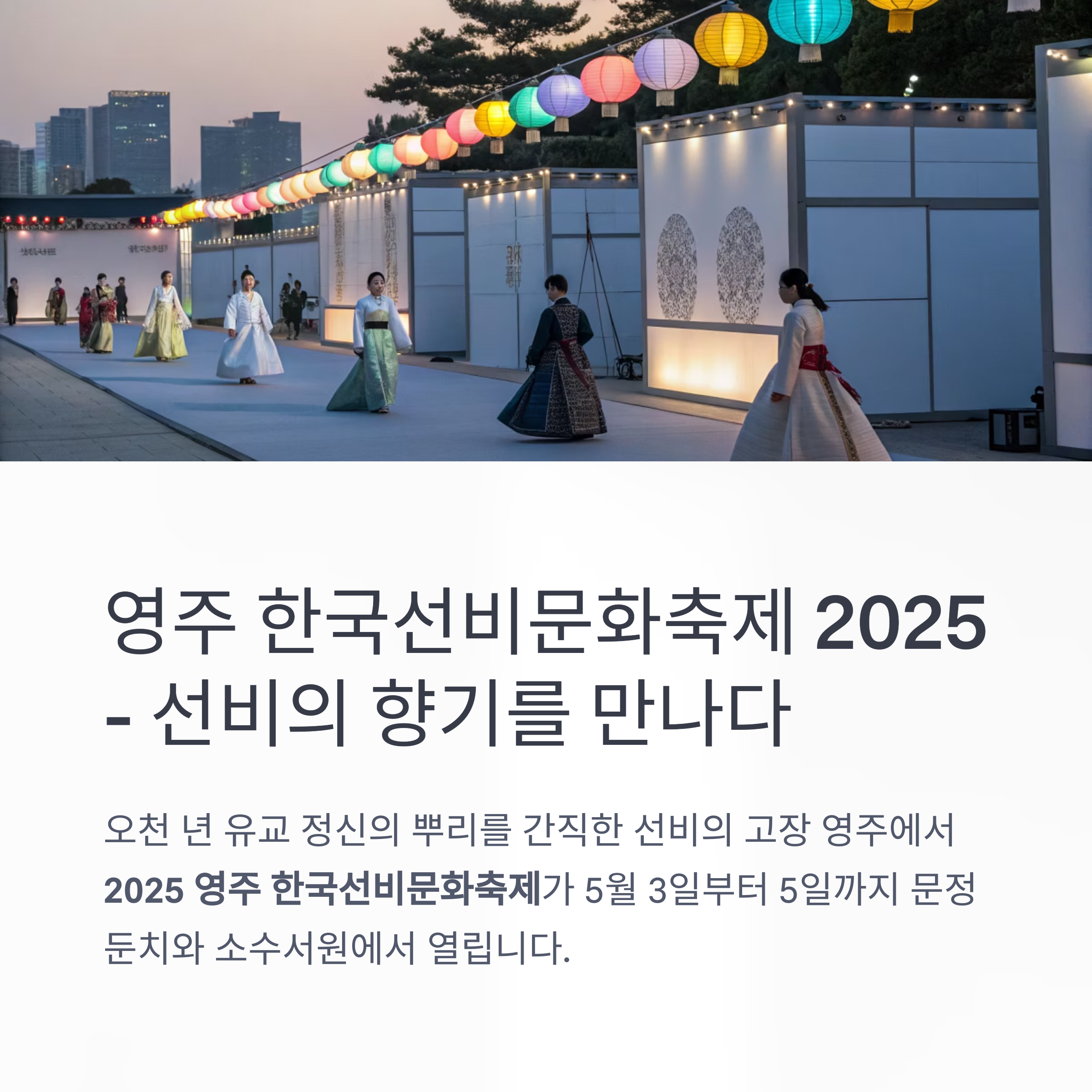 오천 년 유교 정신의 뿌리를 간직한 선비의 고장 영주에서 2025 영주 한국선비문화축제가 5월 3일(토)부터 5월 5일(월)까지 3일간 문정둔치(영주 시민운동장 앞)와 소수서원, 선비촌 일원에서 성대하게 열렸습니다. 올해 축제는 ‘선비의 온기, 만남에서 빚어진 향기’를 주제로, 전통과 현대가 어우러진 다양한 공연, 체험, 전시, 퍼레이드, 야간 유등전시 등 온 가족이 함께 즐길 수 있는 풍성한 프로그램으로 구성되었습니다.