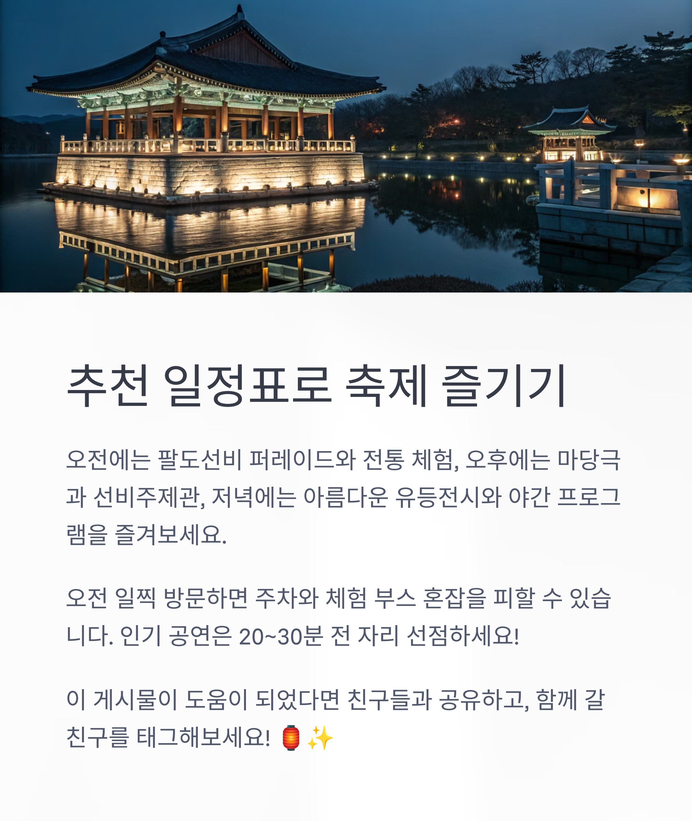 관람 팁: 오전 일찍 방문하면 주차·체험 부스 혼잡을 피할 수 있습니다. 인기 공연과 퍼레이드는 시작 20~30분 전 미리 자리 선점, 축제장 내 안내소에서 지도와 프로그램북을 받아 동선을 계획하면 더욱 알찬 관람이 가능합니다. 축제 후 소수서원, 선비촌, 부석사, 국립산림치유원 등 영주 대표 명소도 함께 둘러보세요.