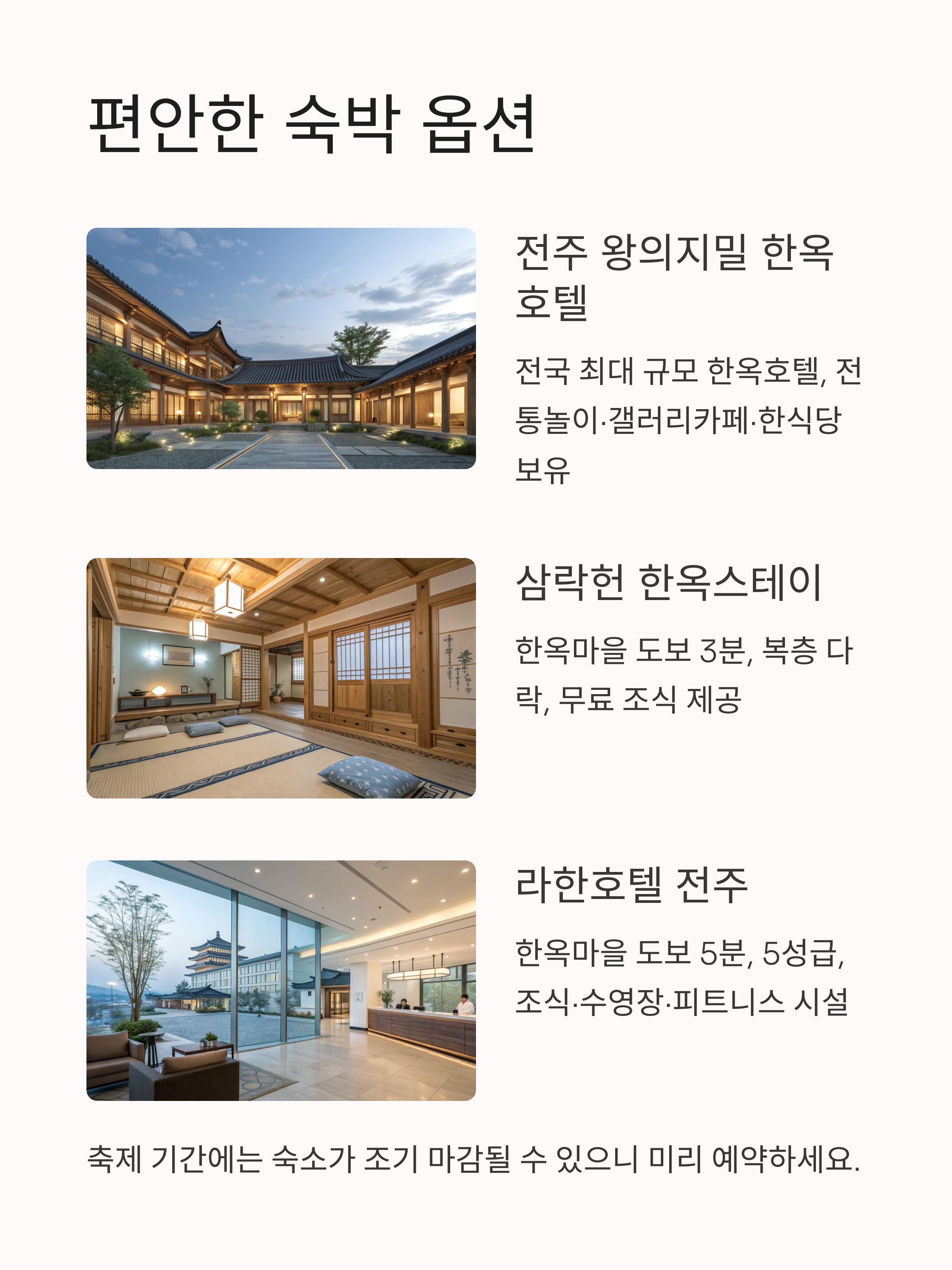 축제 기간에는 시내 중심 숙소가 조기 마감될 수 있으니 미리 예약하는 것이 좋습니다. 한옥스테이, 게스트하우스, 호텔 등 다양한 숙소가 축제장과 한옥마을, 전주역, 경기전, 객리단길 등 도보권에 밀집해 있어 이동이 편리합니다. 가족 단위는 한옥호텔·한옥스테이, 1인·커플은 게스트하우스·호텔도 추천합니다.