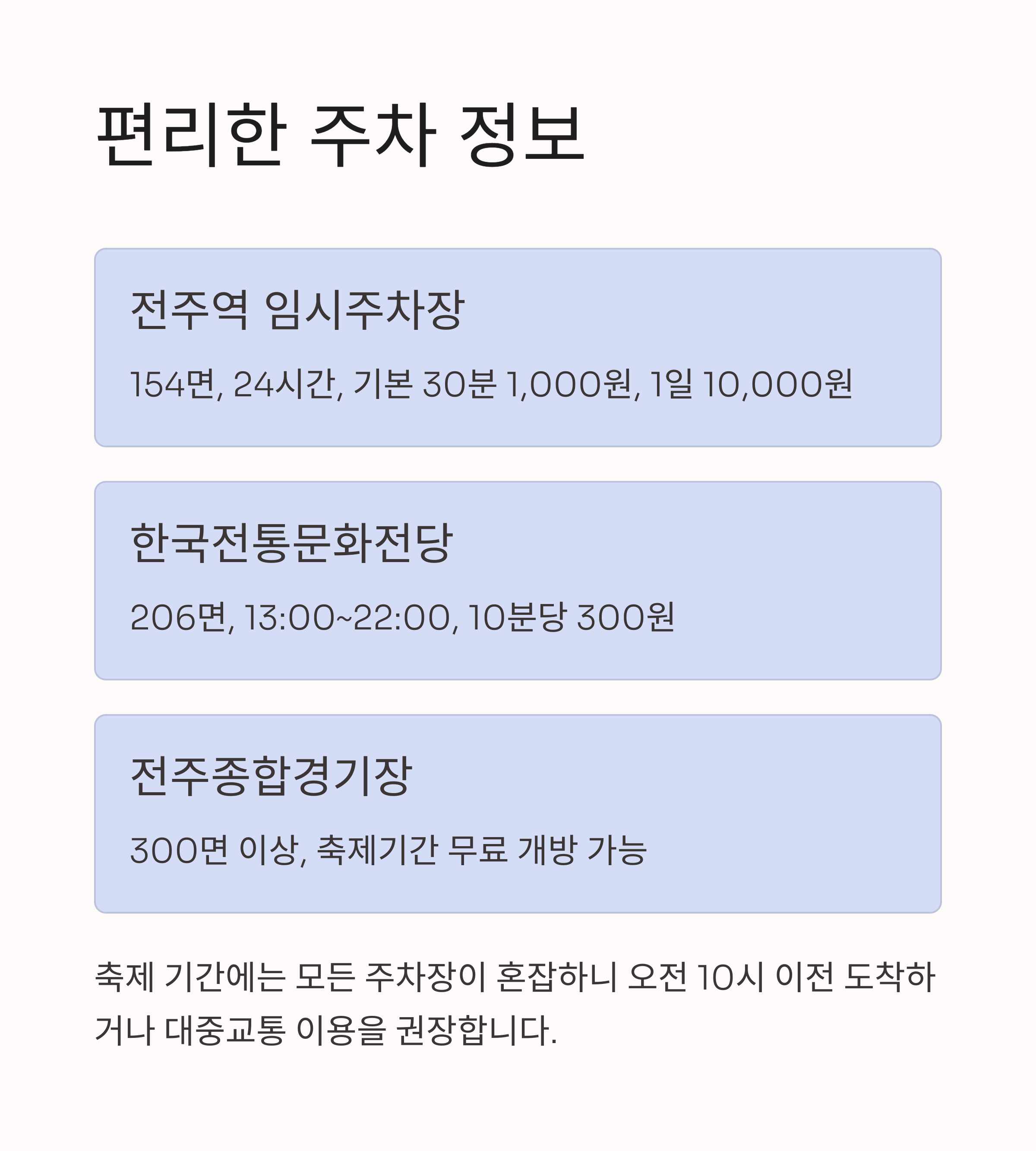 - 300면 이상, 무료/유료 병행(행사기간 무료 개방 가능), 축제장 도보 5분 - 전주초등학교 임시주차장 (완산구 대동로 33)