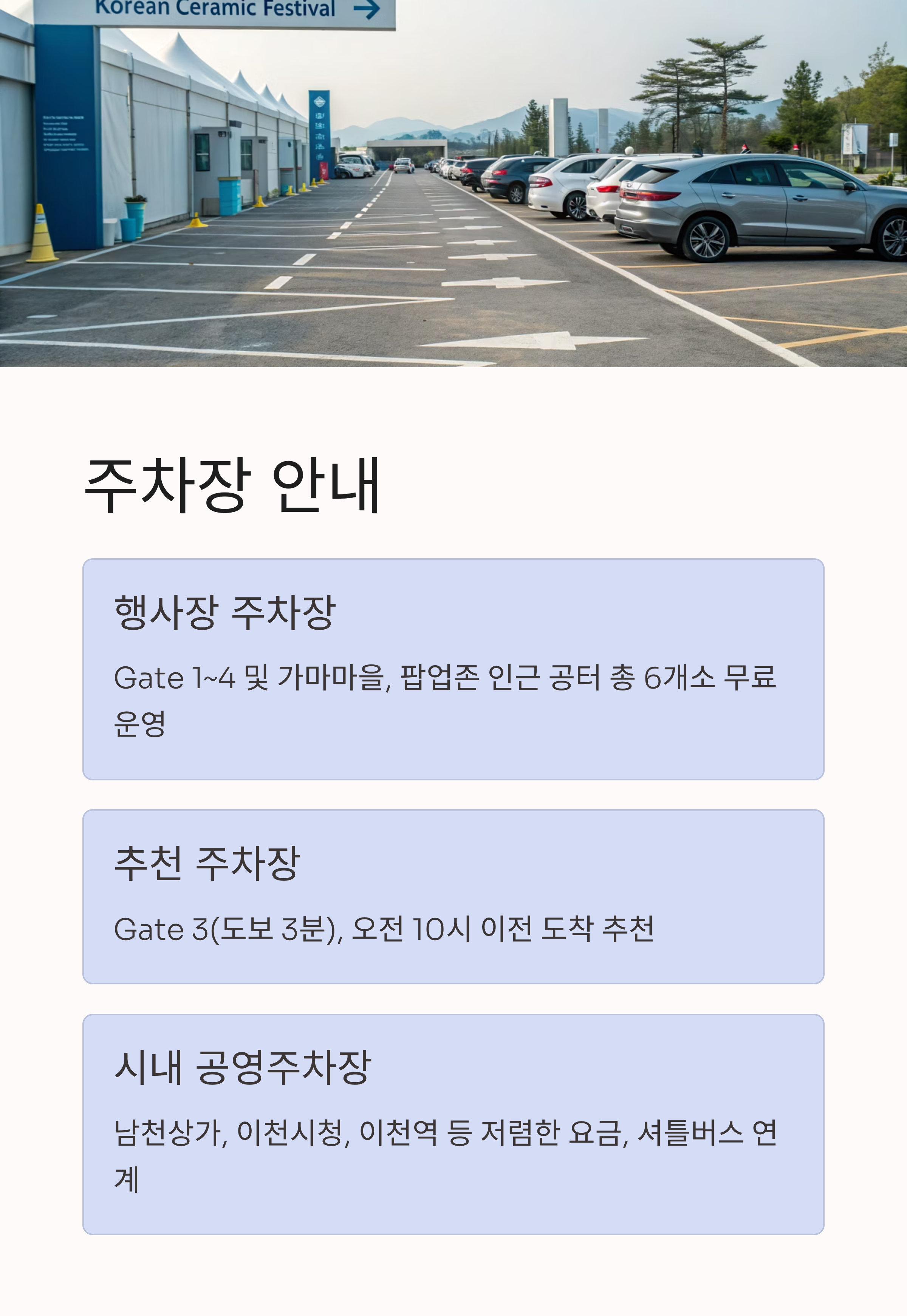 현장 팁: 모든 주차장은 도보 10분 이내로 행사장 접근이 가능하며, 주말·공휴일에는 오전 일찍 도착해야 여유롭게 주차할 수 있습니다. 주차장 바닥은 아스팔트·흙 혼합, 장애인·임산부 전용 구역 별도 운영. 만차 시 인근 임시주차장 안내를 따르세요.