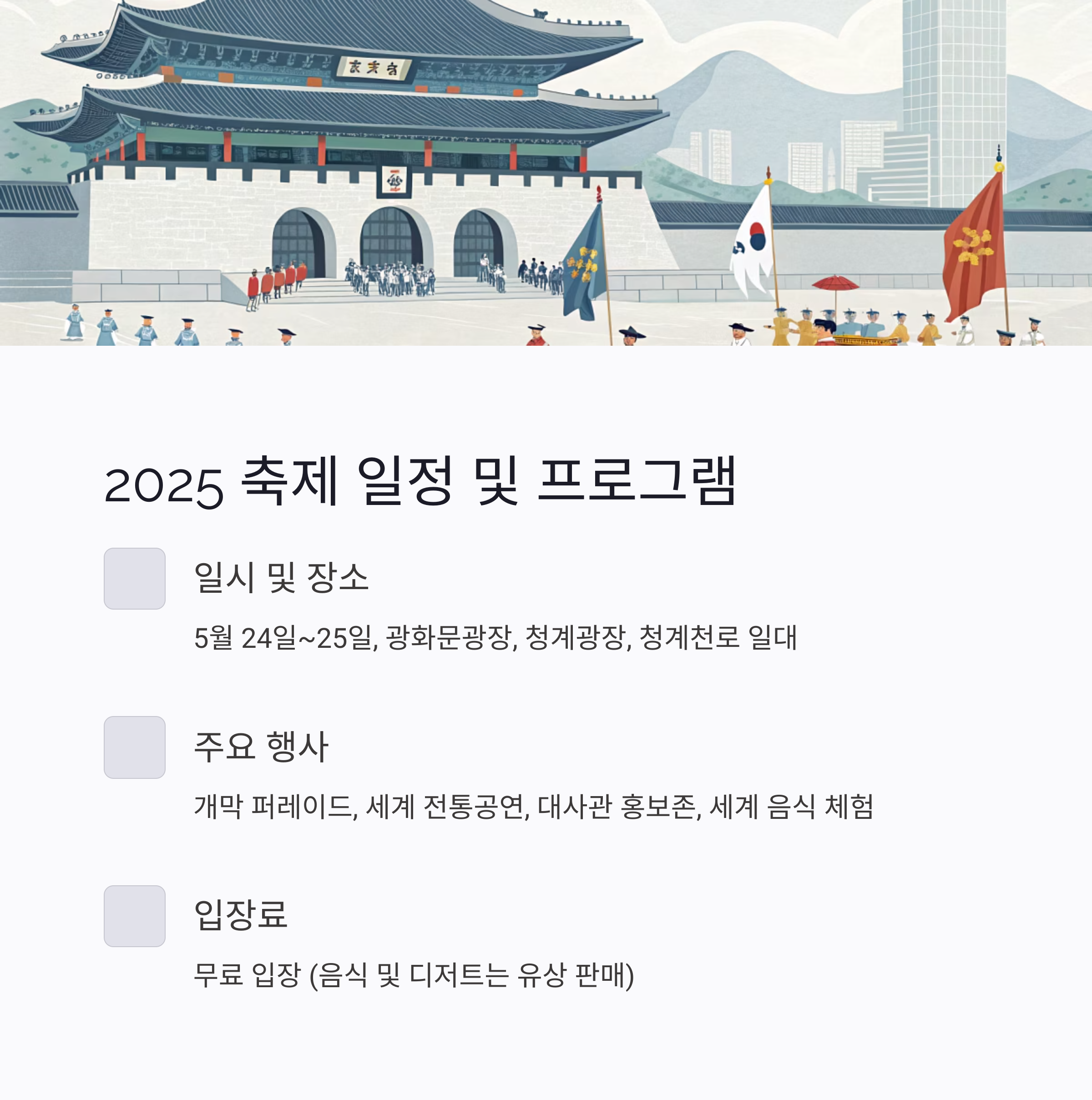 - 축제장 인근은 차량 통제가 많으니 대중교통(지하철 1·2호선 시청역, 5호선 광화문역) 이용이 가장 편리합니다.