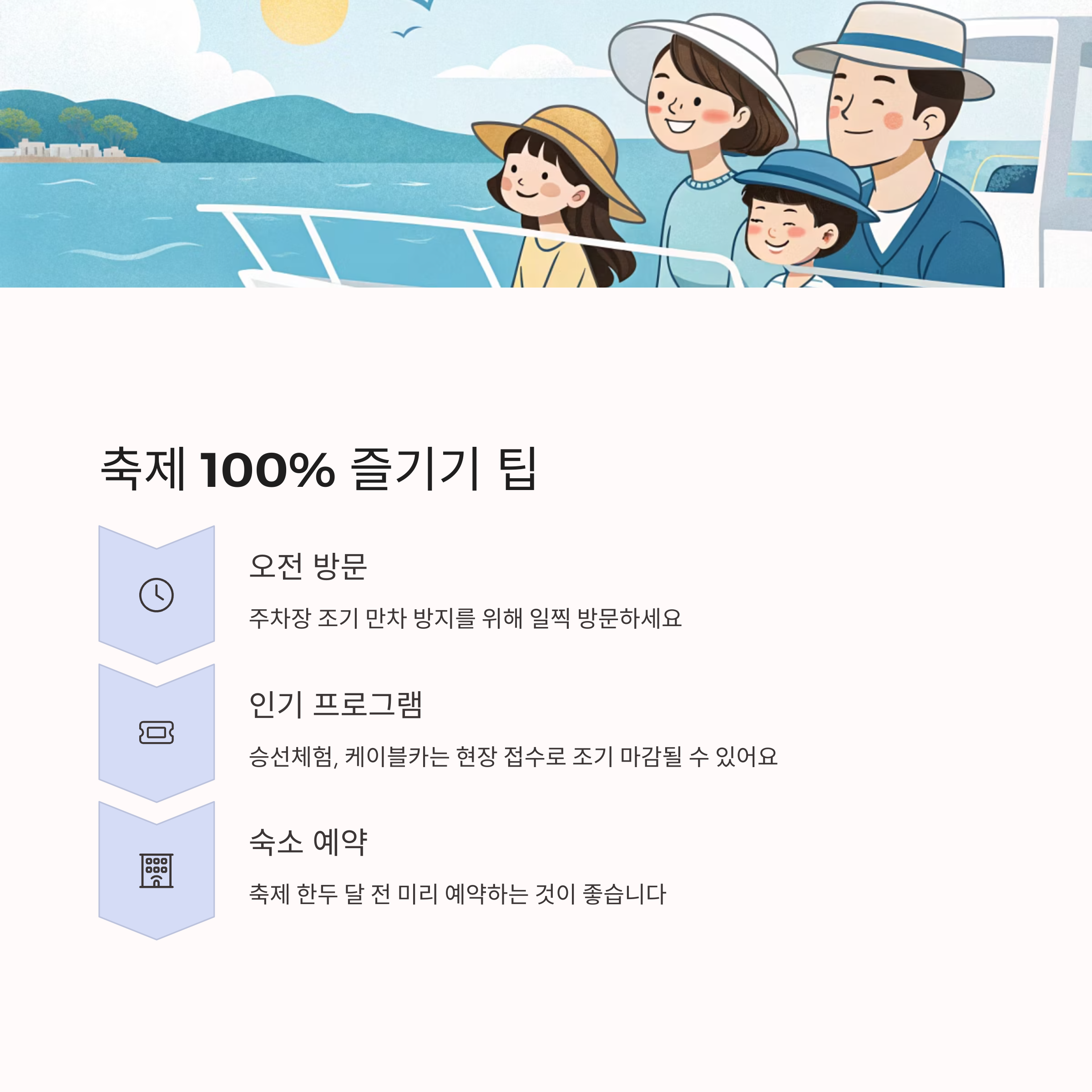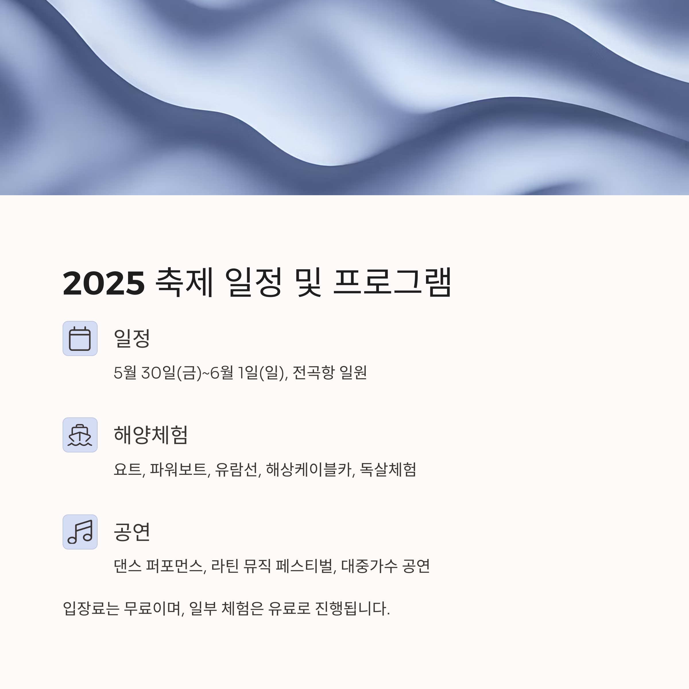 2025 화성 뱃놀이축제는 바다와 해양체험, 문화, 예술, 먹거리가 어우러진 수도권 대표 해양축제입니다. 전곡항 무료주차장, 다양한 숙소까지 미리 준비하면 더욱 여유롭고 즐거운 여행이 될 것입니다. 아래 바로가기를 통해 공식 정보와 예약 사이트를 확인하고, 완벽한 화성 봄나들이를 계획해보세요!