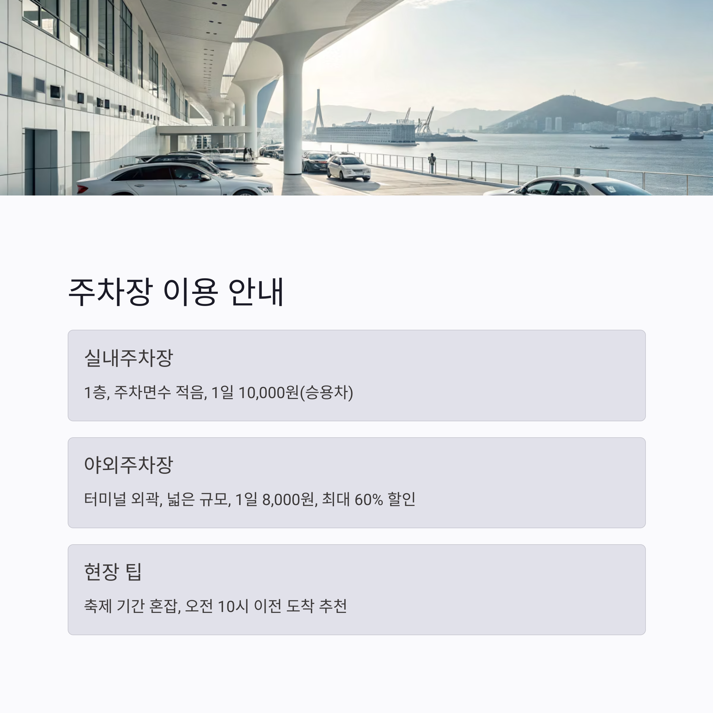 - 야외주차장: 터미널 외곽, 넓은 규모, 1일 8,000원(승용차 기준), 20% 할인, 친환경차·경차·장애인 등 최대 60% 할인