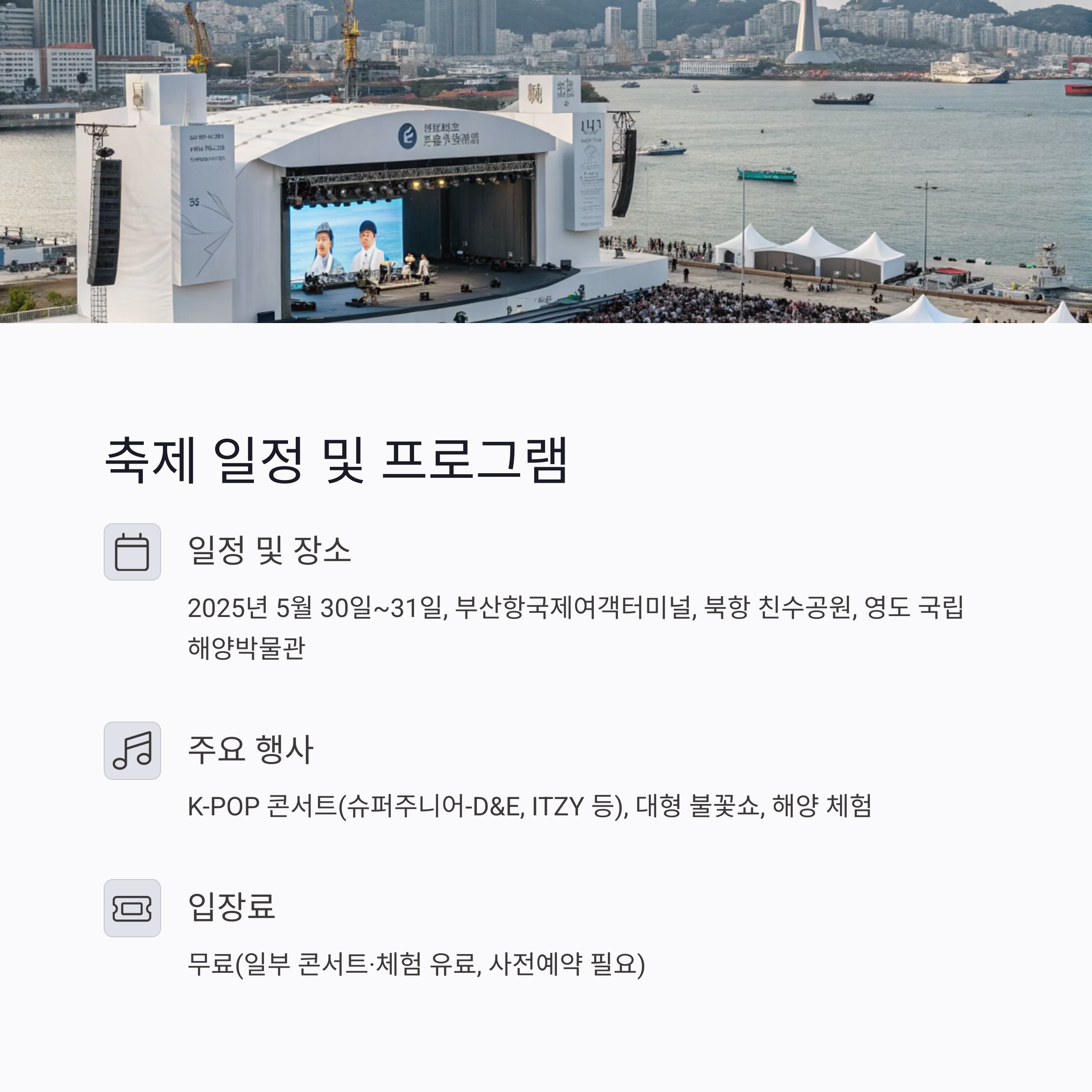 관람 팁: 오전 일찍 방문하면 주차·체험·포토존 혼잡을 피할 수 있습니다. 인기 체험(보트투어, VR, 콘서트 등)은 사전 예약 또는 현장 선착순 마감이니 공식 홈페이지에서 미리 확인하세요. 축제장 내 안내소에서 지도와 프로그램북을 받아 동선을 미리 계획하면 더욱 알찬 관람이 가능합니다. 편한 신발, 모자, 선크림, 보조배터리 등도 챙기면 쾌적하게 즐길 수 있습니다. 축제 후 부산역, 남포동, 해운대 등 부산 대표 명소도 함께 둘러보세요.