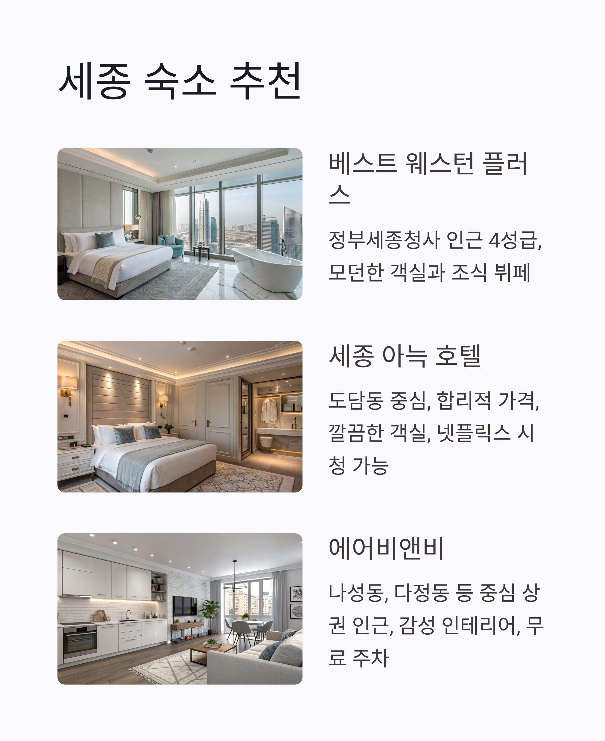 - 세종 더시티 호텔: 정부청사 인근, 모던한 인테리어, 조식 제공, 무료 주차, 비즈니스·가족 모두에 적합.
