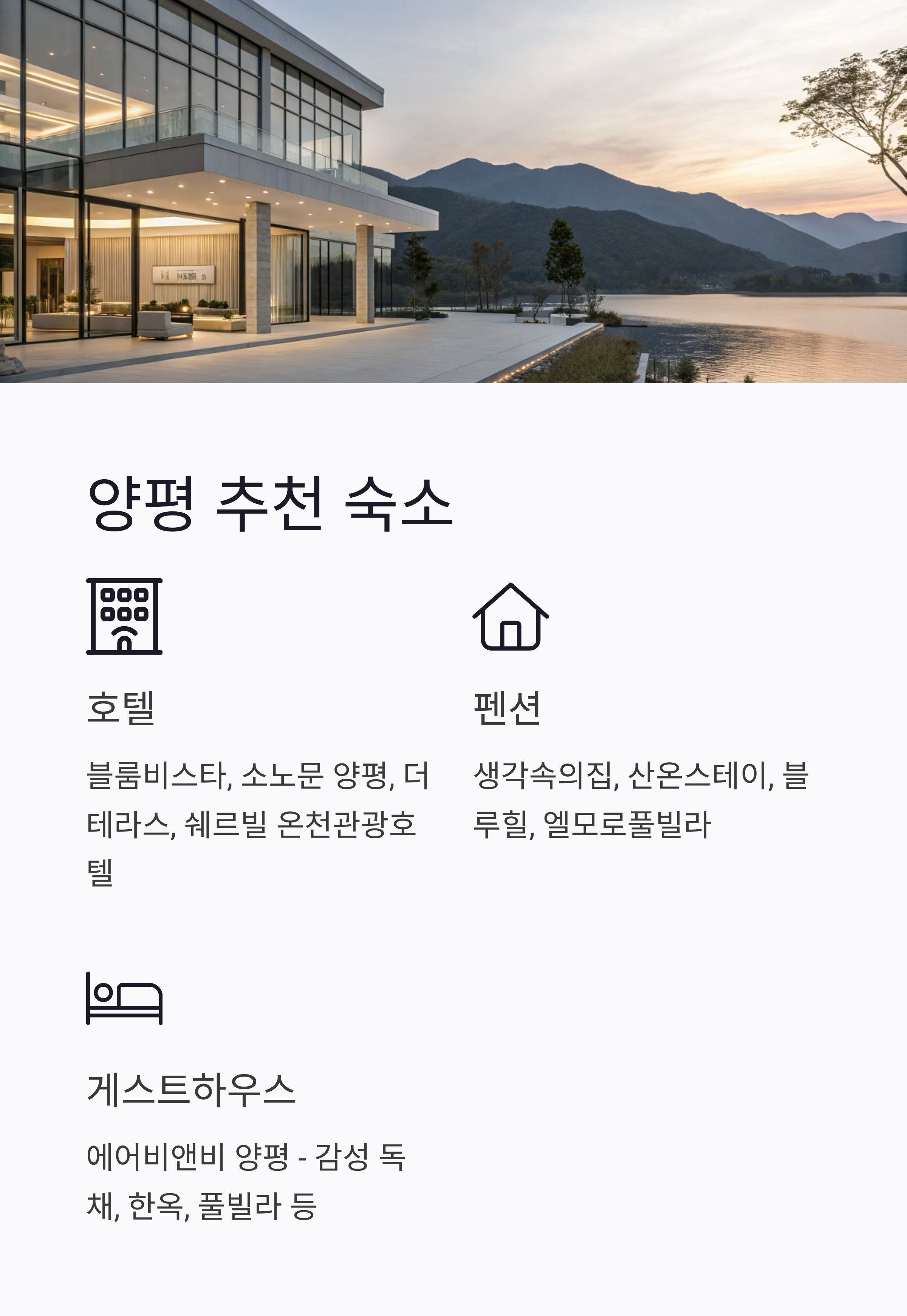 양명 밀축제장과 가까운 양평 시내, 용문, 청운, 단월, 지평, 남한강변 일대에는 다양한 숙박시설이 있습니다. 여행 목적과 예산에 맞게 선택할 수 있는 대표 숙소는 다음과 같습니다.