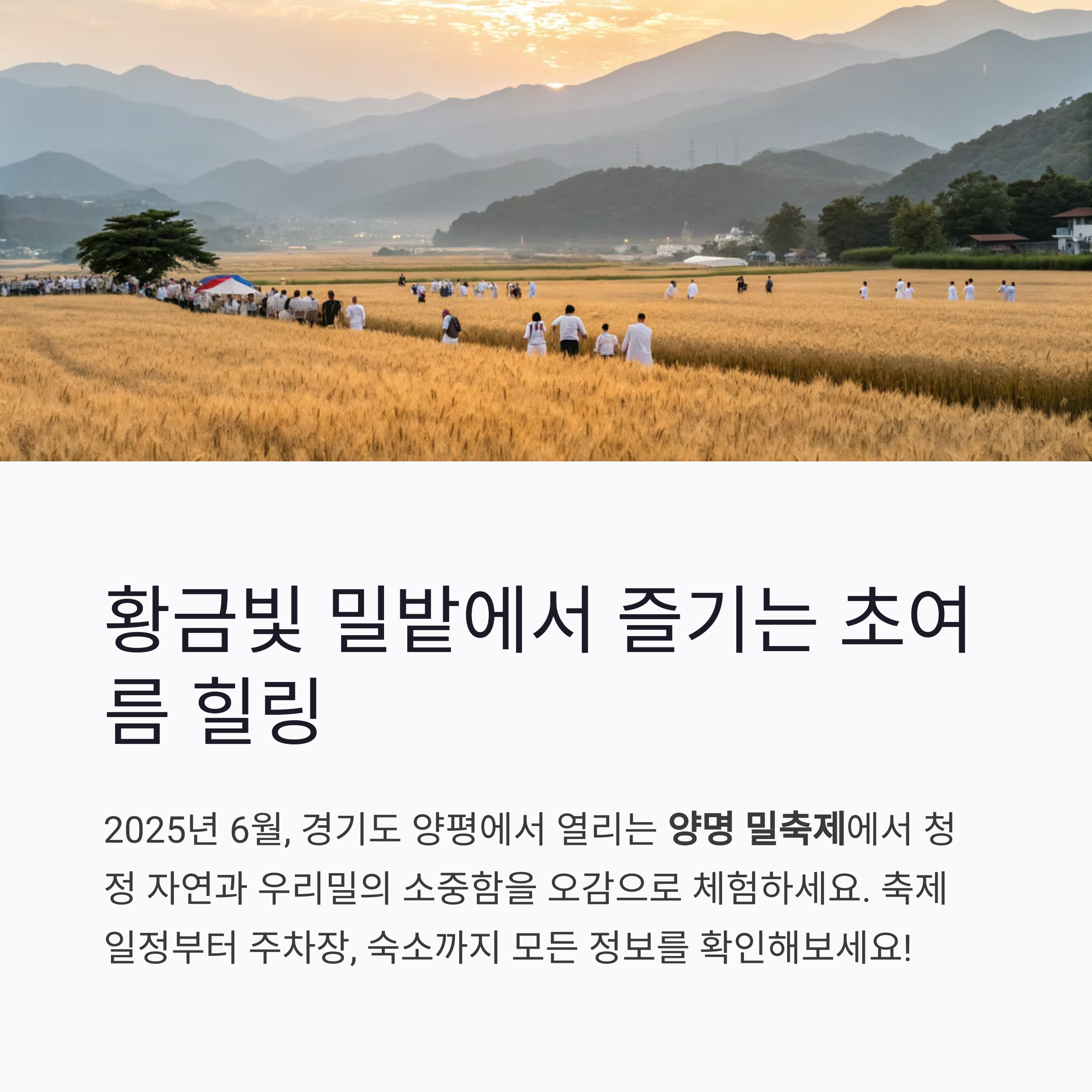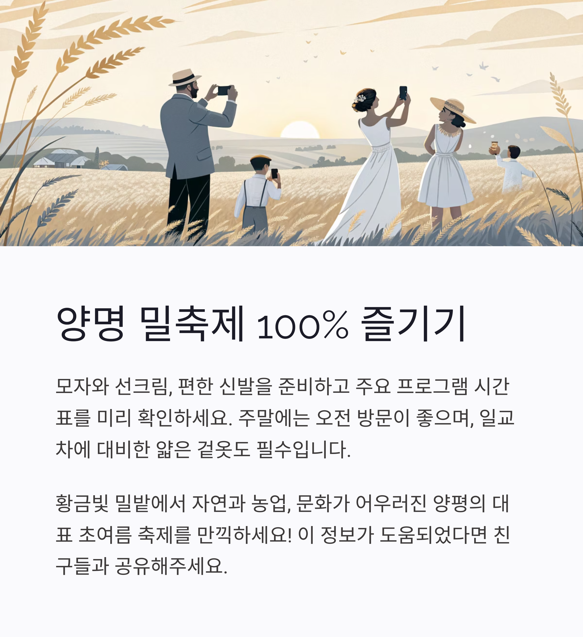 2025 양명 밀축제는 자연과 농업, 문화, 체험이 어우러진 양평의 대표 봄·초여름 축제입니다. 지평역 전용주차장, 다양한 숙소까지 미리 준비하면 더욱 여유롭고 즐거운 여행이 될 것입니다. 공식 정보와 예약 사이트는 본문 내 버튼을 통해 확인하고, 완벽한 양평 밀밭 나들이를 계획해보세요!