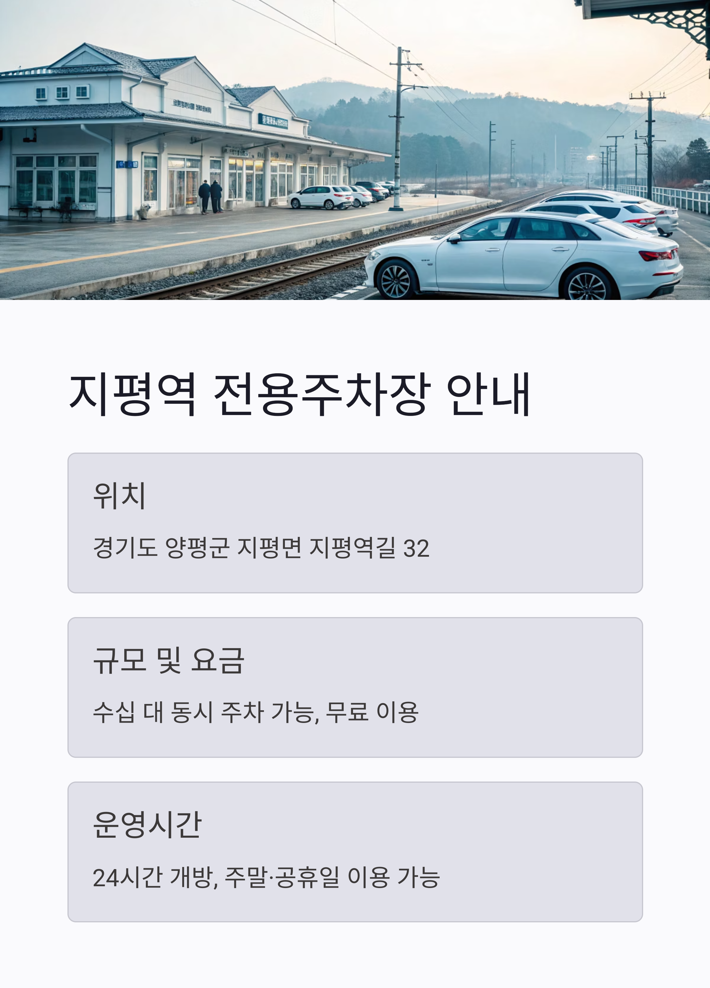 양명 밀축제장과 가까운 지평역은 경의중앙선과 무궁화호가 정차하는 조용한 시골역으로, 축제장 접근성이 뛰어납니다. 지평역 전용주차장은 역 바로 옆에 위치해 있어 기차 이용객과 자가용 방문객 모두 편리하게 이용할 수 있습니다.
