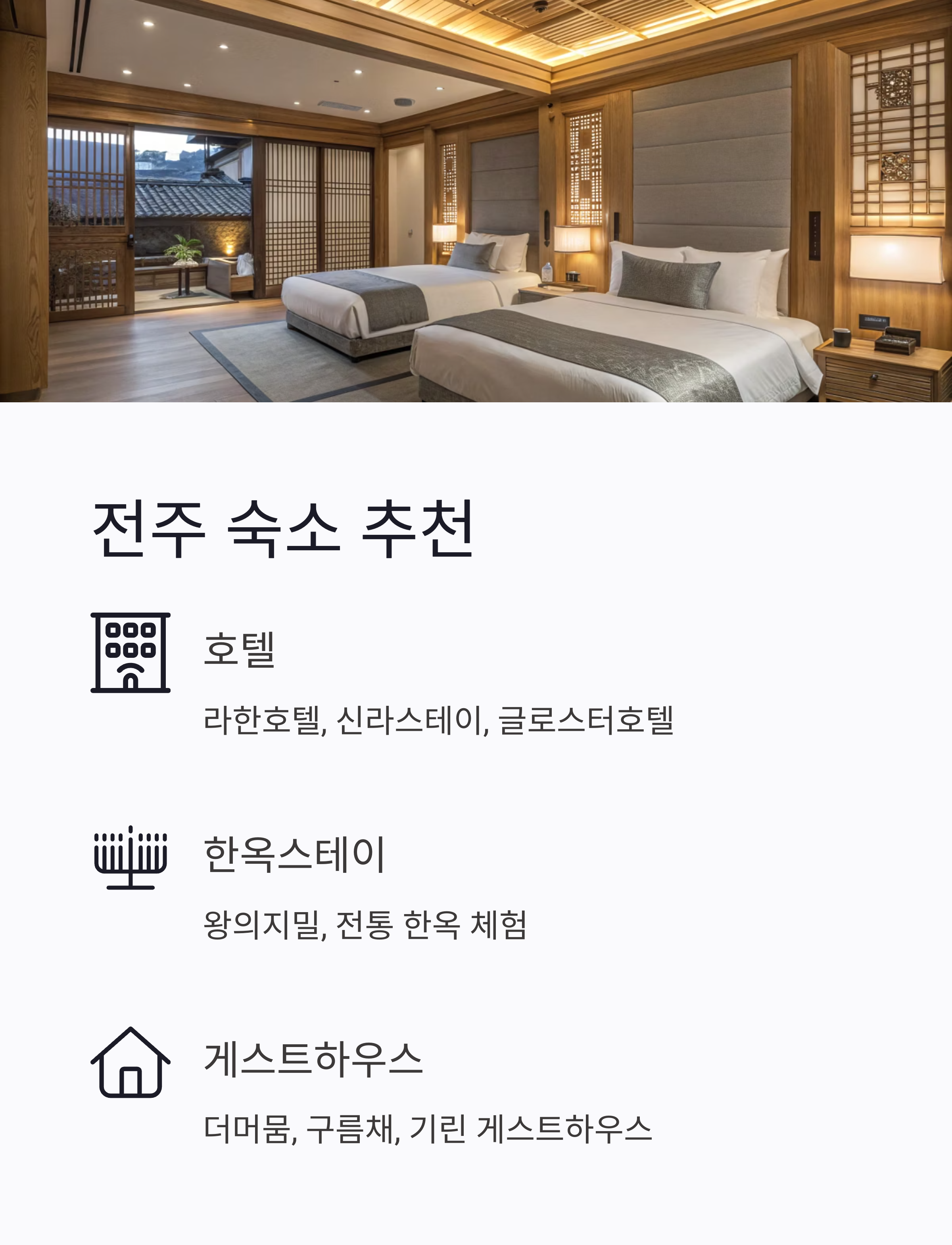 - 숙소는 한옥마을 도보권 또는 주차장 인근을 미리 예약하면 더욱 편리합니다.